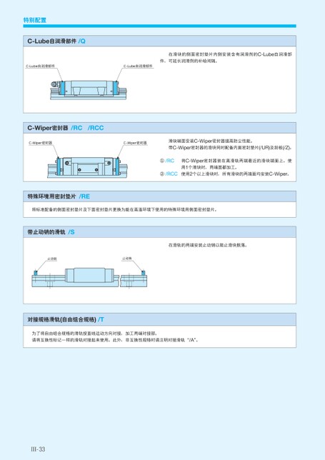 特别配置C-Lube自润滑部件/QC-Lube自润滑部件C-Lube自润滑部件在滑块的侧面密封垫片内侧安装含有润滑剂的C-Lube自润滑部件,可延长润滑剂的补给间隔。C-Wiper密封器/RC/RCCC-Wiper密封器C-Wiper密封器滑块端面安装C-Wiper密封器提高防尘性能。带C-Wiper密封器的滑块同时配备内面密封垫片(/UR)及刮板(/Z)。①/RC②/RCC将C-Wiper密封器装在离滑轨两端最近的滑块端面上。使用1个滑块时,两端面都加工。使用2个以上滑块时,所有滑块的两端面均安装C-Wiper。特殊环境用密封垫片/RE将标准配备的侧面密封垫片及下面密封垫片更换为能在高温环境下使用的特殊环境用侧面密封垫片。带止动销的滑轨/S止动销止动销在滑轨的两端安装止动销以阻止滑块脱落。对接规格滑轨(自由组合规格)/T为了将自由组合规格的滑轨按直线运动方向对接,加工两端对接部。请将互换性标记一样的滑轨对接起来使用。此外,非互换性规格时请注明对接滑轨“/A”。Ⅲ-33