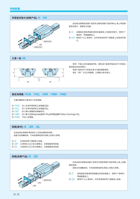 特别配置双层密封垫片(成套产品)/V/VV间座侧面密封垫片侧面密封垫片几套一组/WHa套b套自由组合规格的成套产品或非互换性规格产品的滑块上装上两层侧面密封垫片,提高防尘性能。①/V②/VV在最接近滑轨两端的滑块的端面装上双层密封垫片。使用1个滑块时,两端面都加工。使用2个以上滑块时,在所有滑块的两个端面装上双层密封垫片。将同一平面上的多套直线导轨、圆柱滚子直线导轨的H尺寸的相互差控制在标准范围内。H多套产品的H尺寸的相互差与1套的精度相同。请在“/W”之后注明套数,以根数为单位指示。指定润滑脂/YCG/YCL/YAF/YBR/YNG可通过辅助标记更改封入的润滑脂。①/YCG②/YCL③/YAF④/YBR⑤/YNG封入洁净环境用低尘润滑脂CG2。封入洁净环境用低尘润滑脂CGL。封入耐打滑磨损润滑脂AF2。封入摩力克(Molykote)BR2-Plus润滑脂[道康宁(DowCorning)公司]。不封入润滑脂。刮板(单件)/Z/ZR/ZL在自由组合规格的滑块单件上安装金属制的刮板。刮板为非接触结构,可有效排除粘附在滑轨上的较大异物。①/Z②/ZR③/ZL在滑块的两个端面装上刮板。从滑块的从滑块的标记侧看去,右侧端面装有刮板。标记侧看去,左侧端面装有刮板。刮板(成套产品)/Z/ZZ间座刮板侧面密封垫片Ⅲ-35在自由组合规格的成套产品或非互换性规格产品的滑块上装上金属制的刮板。刮板为非接触结构,可有效排除粘附在滑轨上的较大异物。①/Z②/ZZ将刮板装在离滑轨两端最近的滑块端面上。使用1个滑块时,两端面都加工。使用2个以上滑块时,在所有滑块的两个端面装上刮板。