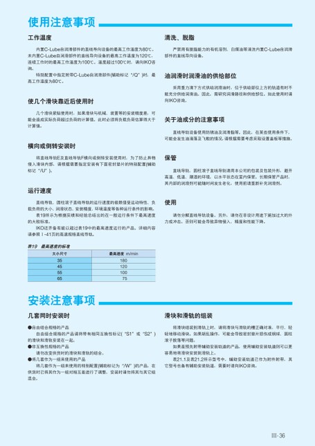 使用注意事项工作温度清洗、脱脂内置C-Lube自润滑部件的直线导向设备的最高工作温度为80℃。未内置C-Lube自润滑部件的直线导向设备的最高工作温度为120℃,连续工作时的最高工作温度为100℃。温度超过100℃时,请向IKO咨询。特别配置中指定附带C-Lube自润滑部件(辅助标记“/Q”)时,最高工作温度为80℃。使几个滑块靠近后使用时严禁用有脱脂能力的有机溶剂、白煤油等清洗内置C-Lube自润滑部件的直线导向设备。油润滑时润滑油的供给部位采用重力滴下方式供给润滑油时,位于供给部位上方的轨道有时不能充分供给润滑油。因此,需研究润滑路径和供给部位。如此使用时请向IKO咨询。几个滑块紧贴使用时,如果滑块与机械、装置等的安装精度差,可能会造成实际负荷超过负荷的计算值。此时必须将负载负荷估算得大于关于油成分的注意事项直线导轨设备使用防锈油及润滑脂等。因此,在某些使用条件下,可能会发生油滴落及飞散的情况,请根据需要考虑采取设置盖板等措施。保管直线导轨、圆柱滚子直线导轨请用本公司的包装及包装外形,避开高温、低温、潮湿的环境,以水平状态在室内保管。长期保管产品时,其内部的润滑剂可能随时间发生老化,使用前请重新补充润滑剂。使用请勿分解直线导轨设备。另外,请勿在非设计用途下施加过大的外力或冲击。否则可能会导致异物侵入、精度和性能下降。计算值。横向或倒转安装时将直线导轨E及直线导轨F横向或倒转安装使用时,为了防止异物侵入滑块内部,请根据需要指定安装有下面密封垫片的特别配置(辅助标记“/U”)。运行速度直线导轨、圆柱滚子直线导轨的运行速度的极限值受运动特性、负载负荷的大小、润滑状态、安装精度、环境温度等各种运行条件的影响。表19所示为根据实绩和经验总结出的在一般运行条件下最高速度的大致标准。IKO还齐备有能以超过表19中的最高速度运行的产品。详细内容请参照Ⅰ-41页的高速规格直线导轨。表19最高速度的标准大小尺寸最高速度m/min3545556518012010075安装注意事项几套同时安装时●自由组合规格的产品滑块和滑轨的组装将滑块组装到滑轨上时,请将滑块与滑轨的槽正确对准,平行、轻自由组合规格的产品请将带有相同互换性标记(“S1”或“S2”)轻地移动滑块。如果胡乱操作,可能会导致密封垫片损伤或钢球、圆柱的滑块和滑轨安装在一起。●非互换性规格的产品滚子脱落等问题。如果是预先附带辅助安装轨道的产品,使用辅助安装轨道则可以更请勿改变供货时的滑块和滑轨的组合。容易地将滑块安装到滑轨上。●将几套作为一组来使用的产品将几套作为一组来使用的特别配置(辅助标记为“/W”)的产品,在供货时已将其作为一组对相互差进行了调整,安装时请勿将其与其它组混合。表21.1及表21.2所示型号中,辅助安装轨道已作为附件附带,其它型号也备有辅助安装轨道,需要时请向IKO咨询。Ⅲ-36