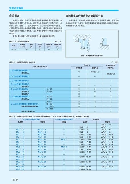 安装注意事项安装精度安装基准面的肩高和角部圆弧半径如果直线导轨、圆柱滚子直线导轨的安装面精度或安装精度差,会导致超出计算值的大负荷发生。该负荷会影响直线导向设备的寿命,必如图8所示,安装侧基准面的角部形状推荐设置清角槽,也可以加工成角部圆弧半径使用。安装侧安装基准面的肩高和角部圆弧半径的推须予以注意。因此,为了提高直线导轨、圆柱滚子直线导轨的可靠性,荐值请参照各系列的解说。必须根据要求的运动精度和刚性等使用条件,保证滑轨和滑块安装部具有较高的加工精度及安装精度,还必须研究能够维持该精度和性能的安装结构。使用几套时各套之间安装平行度的大致标准请参照表20。表202个安装面的平行度单位μm等级平行度普通级(无标记)高级(H)30精密级超精密级超超精密级(P)20(SP)10(UP)6表21.1附带辅助安装轨道的产品系列名称和大小尺寸C-Lube自润滑直线导轨L直线导轨LC-Lube自润滑直线导轨LVC-Lube自润滑直线导轨VC-Lube自润滑直线导轨E直线导轨EC-Lube自润滑直线导轨H直线导轨H直线导轨FC-Lube自润滑直线导轨UL直线导轨UC-Lube自润滑圆柱滚子直线导轨超级X圆柱滚子直线导轨超级X圆柱滚子直线导轨X8~1215~6525、3040~8610~3035~65超长型85、100图8安装基准面的角部形状自由组合滑块单件成套产品○——○○○○——○○○——参照表21.2———○————○—○——○:附带非互换性规格成套产品参照表21.2——○——○—○—○——表21.2附带辅助安装轨道的C-Lube自润滑直线导轨L、C-Lube自润滑直线导轨LV、直线导轨L的型号C-Lube自润滑直线导轨LC-Lube自润滑直线导轨LV直线导轨L宽幅型——MLFCMLFMLFCMLFMLFCMLFMLFGMLFCMLFMLFG—MLFG—MLFG—MLFG—661010141414181818243042标准型标准型宽幅型——————MLV7——MLV9—————————LWLLWLCLWLLWLCLWLLWLCLWLLWLGLWLCLWLLWLG——2335…B5…B7…B7…B7…B9…B9…B9…BLWLFLWLFLWLFCLWLFLWLFCLWLFLWLFCLWLFLWLFGLWLFCLWLFLWLFG246610…B10…B14…B14…B14…B18…B18…B18…B—LWLG12…BLWLFG24…B——LWLG15…BLWLFG30…B—LWLGLWLG20…B25…B—LWLFG42…B—标准型——MLCMLMLCMLMLCMLMLGMLCMLMLGMLLMLGMLLMLGMLLMLGMLG33557779999121215152025Ⅲ-37