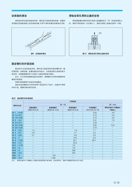 安装面的清洁滑轨安装孔用防尘盖的安装请用油石等去除安装直线导轨、圆柱滚子直线导轨的机械、装置的安装面及安装基准面上的毛刺和伤痕,并用干净的布擦去防锈油及污物。将特别配置的滑轨安装孔用防尘盖(辅助标记“/F”)安装到滑轨上时,请用平坦的挡块一点点地打入,直到与滑轨上表面达到同一平面。挡块图9安装面的清洁图10滑轨安装孔用防尘盖的安装固定螺钉的拧紧扭矩表22所示为安装直线导轨、圆柱滚子直线导轨时固定螺钉的一般拧紧扭矩。如果机械、装置的振动冲击较大,负荷波动较大或者承受力矩负荷,应根据需要采用1.2倍至1.5倍的扭矩进行固定。此外,对方材料是铸铁或铝合金等时,请根据对方材料的强度特性降低拧紧扭矩。详细内容请参照产品各系列的解说。滑轨安装用螺栓作为附件附带于表23所示产品中,也备有不带附件的产品,需要时请向IKO咨询。表22固定螺钉的拧紧扭矩螺钉的公称拧紧扭矩[N·m][N·cm]碳素钢螺钉(强度分类8.8)碳素钢螺钉(强度分类10.9)碳素钢螺钉(强度分类12.9)不锈钢螺钉(性状分类A2-70)精密设备用十字槽盘头小螺丝(1)——0.040.100.150.310.490.620.701.12.55.08.520.4———————0.82.63.87.8—15.8—————————————Ⅲ-38———————————————————1.32.95.71×0.251.4×0.31.6×0.352×0.42.3×0.42.5×0.452.6×0.453×0.54×0.75×0.86×18×1.25MMMMMMMMMMMMM10×1.5M12×1.75M14×2M16×2M20×2.5M24×3M30×3.5注(1)精密设备用十字槽盘头小螺丝的紧固扭矩为参考值。实际使用时,请客户根据使用条件自行设定。1.84.18.013.632.763.9—7491490110175268522————————————————————