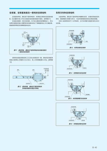 安装面、安装基准面及一般性的安装结构负荷方向和安装结构安装直线导轨、圆柱滚子直线导轨时,将滑轨及滑块的安装基准面当直线导轨、圆柱滚子直线导轨承载横向负荷、交替负荷或波动负B、D正确地对准工作台及底座的安装基准面进行固定。(参照图11)荷时,请按照图13和图14所示,切实牢固地固定滑块及滑轨的侧面。安装基准面B、D及安装面A、C已经过精密的研磨精加工。所以负荷小或使用条件不十分苛刻时,也可采用图15和图16所示的方如果安装侧的机械、装置等的安装面也经过了高精度的加工并正确安装,法安装。就能够获得稳定的高精度直线运动。DCAB图11直线导轨、圆柱滚子直线导轨的安装基准面及一般性的安装结构滑块的安装基准面是有面是正视滑轨上表面的12)标记的相反的一侧。滑轨的安装基准标记,其上方的侧面(箭头方向)。(参照图滑轨滑块安装基准面DB标记标记图12直线导轨、圆柱滚子直线导轨的安装基准面的位置(代表例)安装基准面压板安装基准面图13利用压板的安装例安装基准面安装基准面锥形块图14利用锥形块的安装例安装基准面安装基准面图15利用紧固螺钉的安装例紧固螺钉安装基准面安装基准面固定销图16利用固定销的安装例Ⅲ-40