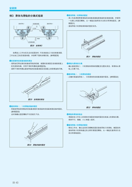 安装例例3滑块与滑轨的分离式组装直线导轨Ⅰ安装基准面直线导轨Ⅱ工作台底座安装基准面图28安装例3直线导轨Ⅰ的滑轨的固定·用小号老虎钳等使滑轨的安装基准面贴紧底座的安装基准面,拧紧同一位置上的固定螺栓。从一端起反复用该方法依次将滑轨固定。(参照图31)·直线导轨Ⅱ的滑轨保持临时固定状态。如果放上工作台后无法切实固定时,可在底座加工1处安装基准面,工作台加工2处安装基准面,并按照下面的步骤安装。(参照图28)图31滑轨的固定安装面和安装基准面的清洁·请用油石等去除安装直线导轨的机械、装置的安装面及安装基准面上的毛刺和伤痕,并用干净的布擦拭(参照图29)。滑轨与滑块的分离·确认直线导轨Ⅰ、Ⅱ的滑轨和滑块的搭配及位置关系后,将滑块从滑·请用干净的布擦去直线导轨的安装基准面及安装面上的防锈油和污物。轨上分离下来。直线导轨Ⅰ、Ⅱ的滑块的固定·正确对准直线导轨Ⅰ、Ⅱ的滑块的安装基准面并固定。(参照图32)图29安装面的清洁直线导轨Ⅰ、Ⅱ的滑轨的临时固定·将直线导轨I的滑轨的安装基准面对准底座的安装基准面后临时固定。(参照图30)此时请确认固定螺栓不与安装孔干涉。图32滑块的固定滑轨和滑块的组合·将固定在工作台上的滑块对准固定和临时固定在底座上的滑轨位置,保持平行,慢慢、小心地套入装好。直线导轨Ⅱ的滑轨的固定·移动工作台,确认运动状况顺畅后固定直线导轨Ⅱ的滑轨。被固定的直线导轨Ⅱ的滑块通过后立即拧紧固定螺栓。从一端起反复用该方法依次将滑轨固定。图30滑轨的临时固定Ⅲ-43
