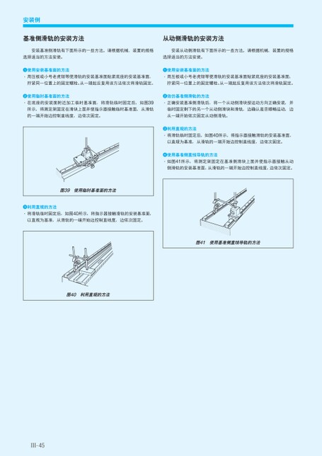 安装例基准侧滑轨的安装方法从动侧滑轨的安装方法安装基准侧滑轨有下面所示的一些方法。请根据机械、装置的规格安装从动侧滑轨有下面所示的一些方法。请根据机械、装置的规格选择适当的方法安装。选择适当的方法安装。使用安装基准面的方法·用压板或小号老虎钳等使滑轨的安装基准面贴紧底座的安装基准面,使用安装基准面的方法·用压板或小号老虎钳等使滑轨的安装基准面贴紧底座的安装基准面,拧紧同一位置上的固定螺栓。从一端起反复用该方法依次将滑轨固定。拧紧同一位置上的固定螺栓。从一端起反复用该方法依次将滑轨固定。使用临时基准面的方法·在底座的安装面附近加工临时基准面,将滑轨临时固定后,如图39所示,将测定架固定在滑块上面并使指示器接触临时基准面,从滑轨效仿基准侧滑轨的方法·正确安装基准侧滑轨后,将一个从动侧滑块按运动方向正确安装,并临时固定剩下的另一个从动侧滑块和滑轨,边确认是否顺畅运动,边的一端开始边控制直线度,边依次固定。从一端开始依次固定从动侧滑轨。利用直规的方法·将滑轨临时固定后,如图40所示,将指示器接触滑轨的安装基准面,以直规为基准,从滑轨的一端开始边控制直线度,边依次固定。使用基准侧直线导轨的方法·如图41所示,将测定架固定在基准侧滑块上面并使指示器接触从动侧滑轨的安装基准面,从滑轨的一端开始边控制直线度,边依次固定。图39使用临时基准面的方法利用直规的方法·将滑轨临时固定后,如图40所示,将指示器接触滑轨的安装基准面,以直规为基准,从滑轨的一端开始边控制直线度,边依次固定。图41使用基准侧直线导轨的方法图40利用直规的方法Ⅲ-45