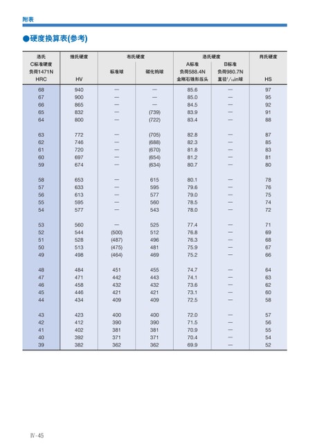 附表●硬度换算表(参考)维氏硬度布氏硬度洛氏硬度肖氏硬度标准球碳化钨球负荷588.4N金刚石锥形压头A标准B标准负荷980.7N直径1/16in球————————————————(500)(487)(475)(464)451442432421409400390381371362———(739)(722)(705)(688)(670)(654)(634)61559557756054352551249648146945544343242140940039038137136285.685.084.583.983.482.882.381.881.280.780.179.679.078.578.077.476.876.375.975.274.774.173.673.172.572.071.570.970.469.9——————————————————————————————HS979592918887858381807876757472716968676664636260585756555452HV940900865832800772746720697674653633613595577560544528513498484471458446434423412402392382洛氏C标准硬度负荷1471NHRC686766656463626160595857565554535251504948474645444342414039Ⅳ-45