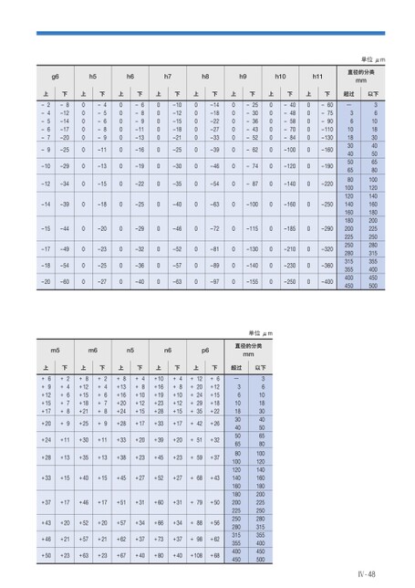 g6h5h6h7h8h9h10h11上–2–4–5–6–7–9下–8–12–14–17–20–25–10–29–12–34–14–39–15–44–17–49–18–54–20–60上0000000000000下–4–5–6–8–9–11–13–15–18–20–23–25–27上0000000000000下–6–8–9–11–13–16–19–22–25–29–32–36–40上0000000000000下–10–12–15–18–21–25–30–35–40–46–52–57–63上0000000000000下–14–18–22–27–33–39–46–54–63–72–81–89–97上0000000000000下–25–30–36–43–52–62–74–87–100–115–130–140–155上0000000000000下–40–48–58–70–84–100–120–140–160–185–210–230–250上0000000000000下–60–75–90–110–130–160–190–220–250–290–320–360–400单位μm直径的分类mm超过以下—36101830405065801001201401601802002252502803153554004503610183040506580100120140160180200225250280315355400450500m5m6n5n6p6上+6+9+12+15+17+20下+2+4+6+7+8+9上+8+12+15+18+21+25下+2+4+6+7+8+9上+8+13+16+20+24+28下+4+8+10+12+15+17上+10+16+19+23+28+33下+4+8+10+12+15+17上+12+20+24+29+35+42下+6+12+15+18+22+26+24+11+30+11+33+20+39+20+51+32+28+13+35+13+38+23+45+23+59+37+33+15+40+15+45+27+52+27+68+43+37+17+46+17+51+31+60+31+79+50+43+20+52+20+57+34+66+34+88+56+46+21+57+21+62+37+73+37+98+62+50+23+63+23+67+40+80+40+108+68单位μm直径的分类mm超过以下—36101830405065801001201401601802002252502803153554004503610183040506580100120140160180200225250280315355400450500Ⅳ-48