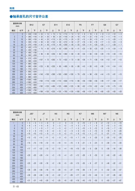 附表Ⅳ-49直径的分类B12E7E11E12F6F7G6G7mm超过以下上下上下上下上下上下上下上下上下400315280250225180160140100806540301863—10501202003554504503553152802502001801601201008050403010631865140225400500+1390+1170+1060+1000+880+800+710+680+590+570+500+430+420+370+300+260+240+330+490+660+840+1250+1470+760+600+540+480+420+340+310+280+240+220+200+180+170+160+150+140+140+150+190+260+380+680+840+61+40+32+24+50+40+25+20+14+32+170+115+95+74+142+40+25+20+14+32+250+175+140+114+212+40+25+20+14+32+33+22+18+12+27+20+13+10+6+16+41+28+22+16+34+20+13+10+6+16+20+14+12+8+17+7+5+4+2+6+28+20+16+12+24+7+5+4+2+6+75+50+210+50+300+50+41+25+50+25+25+9+34+9+90+60+250+60+360+60+49+30+60+30+29+10+40+10+107+72+292+72+422+72+58+36+71+36+34+12+47+12+125+85+335+85+485+85+68+43+83+43+39+14+54+14+146+100+390+100+560+100+79+50+96+50+44+15+61+15+162+110+430+110+630+110+88+56+108+56+49+17+69+17+182+125+485+125+695+125+98+62+119+62+54+18+75+18+198+135+535+135+765+135+108+68+131+68+60+20+83+20直径的分类JS7J7K5K6K7M6M7N6mm超过以下上下上下上下上下上下上下上下上下400315280250200180160120100805040301863—10651402253554504503553152802252001801401201006550403010631880160250400500+10+7+6+5+9–10–7–6–5–9+12+8+6+4+10–9–7–6–6–8+1+100+2–8–5–5–4–6+2+2+20+2–11–7–6–6–9+6+5+30+6–15–10–9–10–12–4–3–1–2–4–17–12–9–8–15000–20–21–15–12–12–18–11–7–5–4–9–24–16–13–10–20+12–12+14–11+2–9+3–13+7–18–4–200–25–12–28+15–15+18–12+3–10+4–15+9–21–5–240–30–14–33+17–17+22–13+2–13+4–18+10–25–6–280–35–16–38+20–20+26–14+3–15+4–21+12–28–8–330–40–20–45+23–23+30–16+2–18+5–24+13–33–8–370–46–22–51+26–26+36–16+3–20+5–27+16–36–9–410–52–25–57+28–28+39–18+3–22+7–29+17–40–10–460–57–26–62+31–31+43–20+2–25+8–32+18–45–10–500–63–27–67●轴承座孔的尺寸容许公差