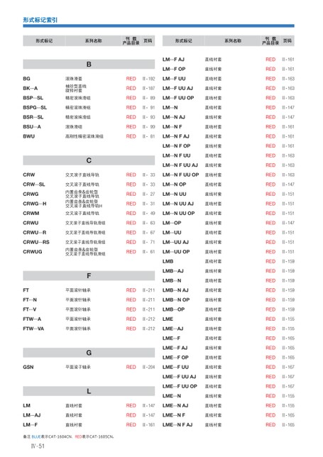形式标记索引形式标记系列名称刊载产品目录页码形式标记系列名称刊载产品目录页码高刚性精密滚珠滑组REDⅡ-81LM…NFAJLM…FAJLM…FOPREDⅡ-192LM…FUUREDⅡ-187LM…FUUAJ直线衬套直线衬套直线衬套直线衬套REDⅡ-89LM…FUUOP直线衬套REDⅡ-91LM…NREDⅡ-93LM…NAJREDⅡ-99LM…NFLM…NFOPLM…NFUULM…NFUUAJ直线衬套REDⅡ-33LM…NFUUOP直线衬套REDⅡ-33LM…NOPREDⅡ-27LM…NUUREDⅡ-31LM…NUUAJ直线衬套直线衬套直线衬套REDⅡ-49LM…NUUOP直线衬套B滚珠滑套袖珍型直线旋转衬套精密滚珠滑组精密滚珠滑组精密滚珠滑组滚珠滑组C交叉滚子直线导轨交叉滚子直线导轨内置齿条&齿轮型交叉滚子直线导轨内置齿条&齿轮型交叉滚子直线导轨H交叉滚子直线导轨BGBK…ABSP…SLBSPG…SLBSR…SLBSU…ABWUCRWCRW…SLCRWGCRWG…HCRWMCRWUCRWU…RCRWU…RSCRWUGFTFT…NFT…VFTW…AFTW…VA交叉滚子直线导轨滑组REDⅡ-63LM…OP交叉滚子直线导轨滑组REDⅡ-67LM…UU交叉滚子直线导轨滑组内置齿条&齿轮型交叉滚子直线导轨滑组REDⅡ-71LM…UUAJREDⅡ-61LM…UUOPF平面滚针轴承平面滚针轴承平面滚针轴承平面滚针轴承平面滚针轴承GLMBLMB…AJLMB…NREDⅡ-211LMB…NAJREDⅡ-211LMB…NOPREDⅡ-211LMB…OPREDⅡ-212LMEREDⅡ-212LME…AJLME…FLME…FAJLME…FOP直线衬套直线衬套直线衬套直线衬套直线衬套直线衬套直线衬套直线衬套直线衬套直线衬套直线衬套直线衬套直线衬套直线衬套直线衬套直线衬套直线衬套直线衬套直线衬套直线衬套直线衬套直线衬套REDⅡ-161REDⅡ-161REDⅡ-163REDⅡ-163REDⅡ-163REDⅡ-147REDⅡ-147REDⅡ-161REDⅡ-161REDⅡ-161REDⅡ-163REDⅡ-163REDⅡ-163REDⅡ-147REDⅡ-151REDⅡ-151REDⅡ-151REDⅡ-147REDⅡ-151REDⅡ-151REDⅡ-151REDⅡ-159REDⅡ-159REDⅡ-159REDⅡ-159REDⅡ-159REDⅡ-159REDⅡ-155REDⅡ-155REDⅡ-165REDⅡ-165REDⅡ-165REDⅡ-167REDⅡ-167REDⅡ-167REDⅡ-155REDⅡ-155REDⅡ-165REDⅡ-165GSN平面滚子轴承REDⅡ-204LME…FUULME…FUUAJ直线衬套LME…FUUOP直线衬套LME…NREDⅡ-147LME…NAJREDⅡ-147LME…NFREDⅡ-161LME…NFAJ直线衬套直线衬套直线衬套直线衬套L直线衬套直线衬套直线衬套LMLM…AJLM…F备注BLUE表示CAT-1604CN、RED表示CAT-1605CN。Ⅳ-51
