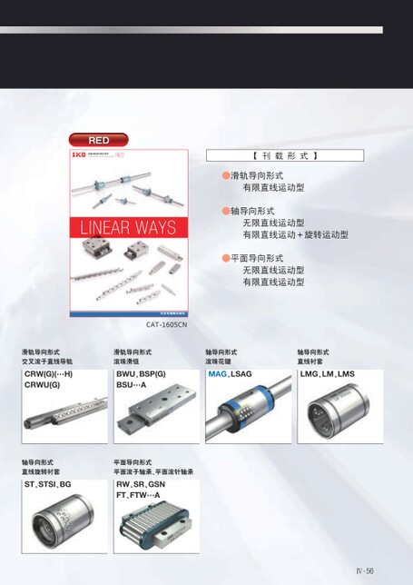 Ⅳ-56【刊载形式】●滑轨导向形式有限直线运动型●轴导向形式无限直线运动型有限直线运动+旋转运动型●平面导向形式无限直线运动型有限直线运动型LINEARWAYSLIEARMOTINROLLINGGUIDEREDREDREDLIEARMOTINROLLIGGUIDEREDCAT-1588CNPrntedinChina©2021.9(AKA)CAT-1605CN滑轨导向形式交叉滚子直线导轨CRW(G)(…H)CRWU(G)滑轨导向形式滚珠滑组BWU、BSP(G)BSU…A轴导向形式滚珠花键MAG、LSAG轴导向形式直线衬套LMG、LM、LMS轴导向形式直线旋转衬套ST、STSI、BG平面导向形式平面滚子轴承、平面滚针轴承RW、SR、GSNFT、FTW…A