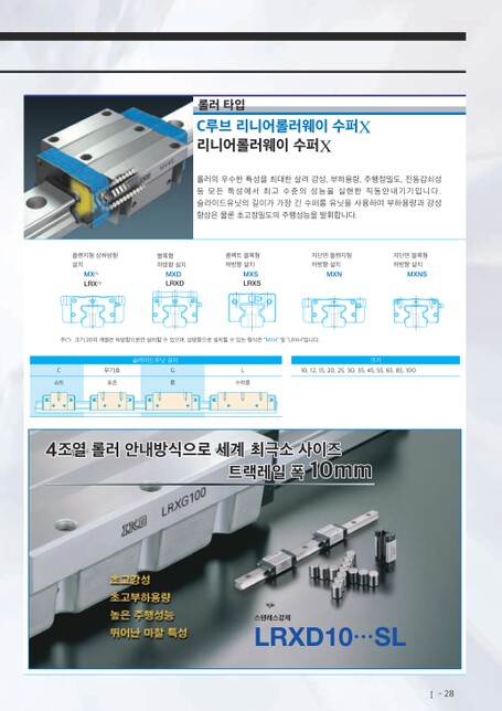 롤러타입C루브리니어롤러웨이수퍼X리니어롤러웨이수퍼X롤러의우수한특성을최대한살려강성,부하용량,주행정밀도,진동감쇠성등모든특성에서최고수준의성능을실현한직동안내기기입니다.슬라이드유닛의길이가가장긴수퍼롱유닛을사용하여부하용량과강성향상은물론초고정밀도의주행성능을발휘합니다.플랜지형상하방향설치MX(1)LRX(1)블록형하방향설치MXDLRXD콤팩트블록형하방향설치MXSLRXS저단면플랜지형하방향설치MXN저단면블록형하방향설치MXNS주(1)크기20의계열은하방향으로만설치할수있으며,상방향으로설치할수있는형식은"MXH"및"LRXH"입니다.슬라이드유닛길이C쇼트무기호표준G롱L수퍼롱10,12,15,20,25,30,35,45,55,65,85,100크기4조열롤러안내방식으로세계최극소사이즈트랙레일폭10mm스텐레스강제LRXD10…SL1-28