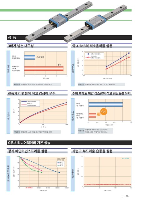 전송속도m/min100C루브리니어웨이L하이브리드C루브리니어웨이L50454035302510소음레벨dB(A)저소음성012내구수명비34손상발생중단C루브리니어웨이L하이브리드C루브리니어웨이L고속성능3배가넘는내구성약4.5dB의저소음화를실현시험조건모델번호:ML12속도:300m/min가속도:40G시험조건모델번호:ML12측정속도:30,60,90m/min전동체의변형이적고강성이우수주행후에도예압감소량이적고정밀도를유지성능약1/4C루브리니어웨이L하이브리드C루브리니어웨이L내마모성500하중N1000예압감소량비00.250.50.7511.25C루브리니어웨이L하이브리드C루브리니어웨이L1210864200변위μm고강성시험조건모델번호:ML12예압:표준예압부하방향:하향시험조건모델번호:ML12속도:300m/min가속도:40G주행거리:13,000kmC루브리니어웨이의기본성능장기메인터넌스프리를실현가볍고부드러운습동을실현ML9표준예압50100150이동거리mm1-383.02.01.000습동저항N습동특성그리스봉입없음부하하중없음ML9ML12ML1520000km400006000080000100000주행거리km1008060402000윤활유공급량wt%메인터넌스프리