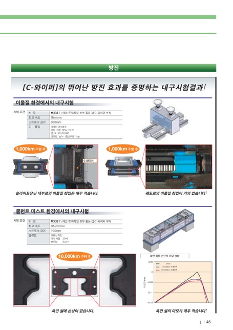 방진[C-와이퍼]의뛰어난방진효과를증명하는내구시험결과!이물질환경에서의내구시험시험조건시료MX35T3예압/트랙레일취부홀용캡·C-와이퍼부착최고속도18m/min스트로크길이500mm이물질미세한금속분진입자직경125μm이하경도40~50HRC산포량1g/hr(총산포량:1kg)1,000km주행후1,000km주행후C-와이퍼측면씰에손상이없습니다.측면씰의마모가매우적습니다!1-460km1,000km주행후10,000km주행후0.050-0.05-0.1-0.15마모량mm10,000km주행후측면씰립선단의마모상황슬라이드유닛내부로의이물질침입은매우적습니다.궤도로의이물질침입이거의없습니다!쿨런트미스트환경에서의내구시험시험조건시료MX35T3예압/트랙레일취부홀용캡·C-와이퍼부착최고속도115.2m/min스트로크길이300mm쿨런트가용성타입희석배율분무량20배5cc/hr