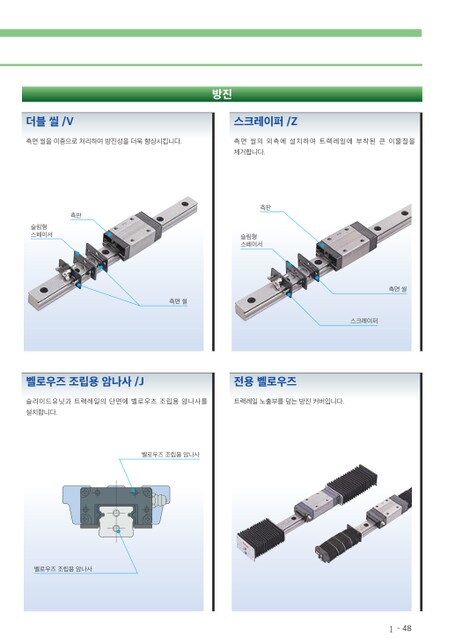 방진더블씰/V스크레이퍼/Z측면씰을이중으로처리하여방진성을더욱향상시킵니다.측면씰의외측에설치하여트랙레일에부착된큰이물질을측판슬림형스페이서제거합니다.측판슬림형스페이서측면씰측면씰스크레이퍼벨로우즈조립용암나사/J전용벨로우즈슬라이드유닛과트랙레일의단면에벨로우즈조립용암나사를트랙레일노출부를덮는방진커버입니다.설치합니다.벨로우즈조립용암나사벨로우즈조립용암나사1-48