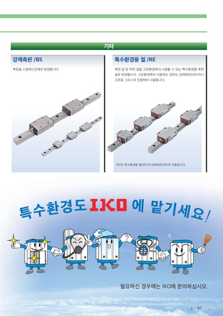 강제측판/BS측판을스텐레스강제로변경합니다.기타특수환경용씰/RE측면씰및하면씰을고온환경에서사용할수있는특수환경용측면씰로변경합니다.고온환경에서사용하는경우는강제측판(/BS)이나고온용그리스와조합하여사용합니다.사진은특수환경용씰(/RE)과강제측판(/BS)의조합입니다.특수환경도에맡기세요!필요하신경우에는IKO에문의하십시오.1-50
