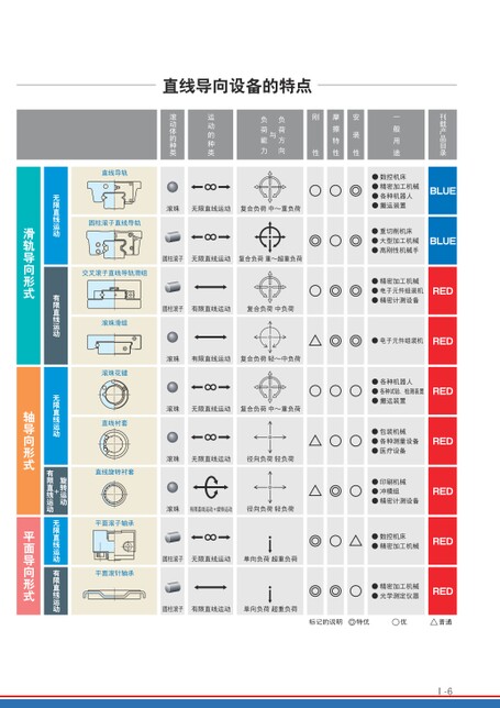 刊载产品目录一般用途刚性摩擦特性安装性负荷方向与负荷能力运动的种类滚动体的种类直线导向设备的特点直线导轨圆柱滚子直线导轨滚珠无限直线运动复合负荷中~重负荷圆柱滚子无限直线运动复合负荷重~超重负荷交叉滚子直线导轨滑组圆柱滚子有限直线运动复合负荷中负荷滚珠有限直线运动复合负荷轻~中负荷滚珠无限直线运动复合负荷中~重负荷滚珠无限直线运动径向负荷轻负荷滚珠有限直线运动+旋转运动径向负荷轻负荷圆柱滚子无限直线运动单向负荷超重负荷滚珠滑组滚珠花键直线衬套直线旋转衬套平面滚子轴承平面滚针轴承●数控机床●精密加工机械●各种机器人●搬运装置BLUE●重切削机床●大型加工机械●高刚性机械手BLUE●精密加工机械●电子元件组装机●精密计测设备RED●电子元件组装机RED●各种机器人●各种试验、检测装置●搬运装置RED●包装机械●各种测量设备●医疗设备RED●印刷机械●冲模组●精密计测设备RED●数控机床●精密加工机械RED●精密加工机械●光学测定仪器RED圆柱滚子有限直线运动单向负荷超重负荷标记的说明特优优普通Ⅰ-6无限直线运动有限直线运动无限直线运动旋转运动+有限直线运动无限直线运动有限直线运动滑轨导向形式轴导向形式平面导向形式