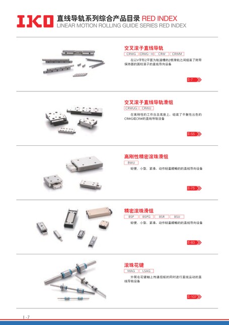 直线导轨系列综合产品目录REDINDEXLINEARMOTIONROLLINGGUIDESERIESREDINDEX交叉滚子直线导轨CRWCRWMCRWGCRWG…H在以V字形2平面为轨道槽的2根滑轨之间组装了附带保持器的圆柱滚子的直线导向设备Ⅱ-7交叉滚子直线导轨滑组CRWUGCRWU在高刚性的工作台及底座上,组装了平衡性出色的CRWG或CRW的直线导轨设备Ⅱ-55高刚性精密滚珠滑组BWU轻便、小型、紧凑,动作轻盈顺畅的的直线导向设备Ⅱ-75精密滚珠滑组BSPBSPGBSRBSU轻便、小型、紧凑,动作轻盈顺畅的的直线导向设备Ⅱ-83滚珠花键MAGLSAG外筒在花键轴上传递扭矩的同时进行直线运动的直线导轨设备Ⅱ-107Ⅰ-7