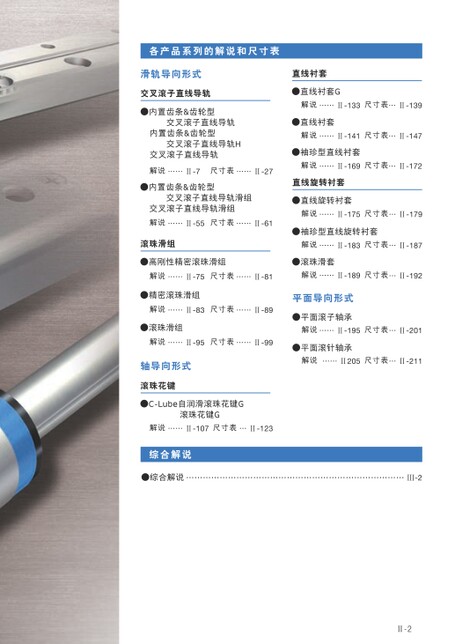 各产品系列的解说和尺寸表滑轨导向形式交叉滚子直线导轨●内置齿条&齿轮型交叉滚子直线导轨内置齿条&齿轮型交叉滚子直线导轨H交叉滚子直线导轨解说⋯⋯Ⅱ-7尺寸表⋯⋯Ⅱ-27●内置齿条&齿轮型交叉滚子直线导轨滑组交叉滚子直线导轨滑组解说⋯⋯Ⅱ-55尺寸表⋯⋯Ⅱ-61滚珠滑组直线衬套●直线衬套G解说⋯⋯Ⅱ-133尺寸表⋯Ⅱ-139●直线衬套解说⋯⋯Ⅱ-141尺寸表⋯Ⅱ-147●袖珍型直线衬套解说⋯⋯Ⅱ-169尺寸表⋯Ⅱ-172直线旋转衬套●直线旋转衬套解说⋯⋯Ⅱ-175尺寸表⋯Ⅱ-179●袖珍型直线旋转衬套解说⋯⋯Ⅱ-183尺寸表⋯Ⅱ-187●高刚性精密滚珠滑组●滚珠滑套解说⋯⋯Ⅱ-75尺寸表⋯⋯Ⅱ-81解说⋯⋯Ⅱ-189尺寸表⋯Ⅱ-192●精密滚珠滑组解说⋯⋯Ⅱ-83尺寸表⋯⋯Ⅱ-89平面导向形式●平面滚子轴承●滚珠滑组解说⋯⋯Ⅱ-195尺寸表⋯Ⅱ-201解说⋯⋯Ⅱ-95尺寸表⋯⋯Ⅱ-99●平面滚针轴承解说⋯⋯Ⅱ205尺寸表⋯Ⅱ-211轴导向形式滚珠花键●C-Lube自润滑滚珠花键G滚珠花键G解说⋯⋯Ⅱ-107尺寸表⋯Ⅱ-123综合解说●综合解说⋯⋯⋯⋯⋯⋯⋯⋯⋯⋯⋯⋯⋯⋯⋯⋯⋯⋯⋯⋯⋯⋯⋯⋯⋯⋯Ⅲ-2Ⅱ-2