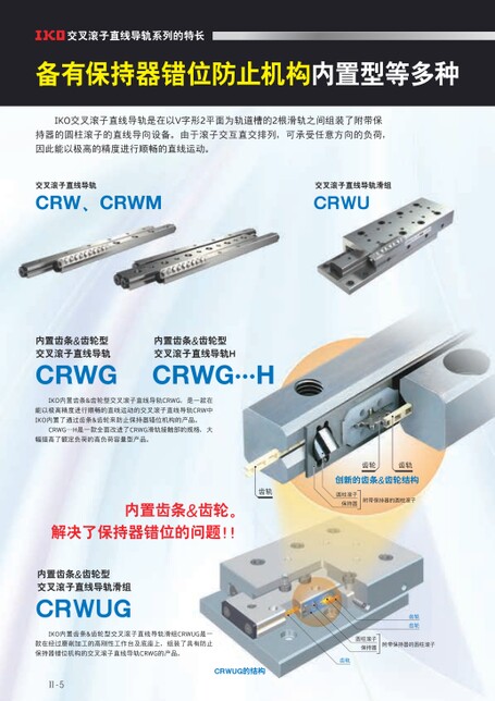 交叉滚子直线导轨系列的特长备有保持器错位防止机构内置型等多种IKO交叉滚子直线导轨是在以V字形2平面为轨道槽的2根滑轨之间组装了附带保持器的圆柱滚子的直线导向设备。由于滚子交互直交排列,可承受任意方向的负荷,因此能以极高的精度进行顺畅的直线运动。交叉滚子直线导轨CRW、CRWM交叉滚子直线导轨滑组CRWU内置齿条&齿轮型交叉滚子直线导轨CRWG内置齿条&齿轮型交叉滚子直线导轨HCRWG···HIKO内置齿条&齿轮型交叉滚子直线导轨CRWG,是一款在能以极高精度进行顺畅的直线运动的交叉滚子直线导轨CRW中IKO内置了通过齿条&齿轮来防止保持器错位机构的产品。CRWG⋯H是一款全面改进了CRWG滑轨接触部的规格,大幅提高了额定负荷的高负荷容量型产品。齿轨齿轮齿轨创新的齿条&齿轮结构圆柱滚子保持器附带保持器的圆柱滚子内置齿条&齿轮。解决了保持器错位的问题!!内置齿条&齿轮型交叉滚子直线导轨滑组CRWUGIKO内置齿条&齿轮型交叉滚子直线导轨滑组CRWUG是一款在经过磨削加工的高刚性工作台及底座上,组装了具有防止保持器错位机构的交叉滚子直线导轨CRWG的产品。Ⅱ-5CRWUG的结构齿轨齿轮圆柱滚子保持器附带保持器的圆柱滚子齿轨