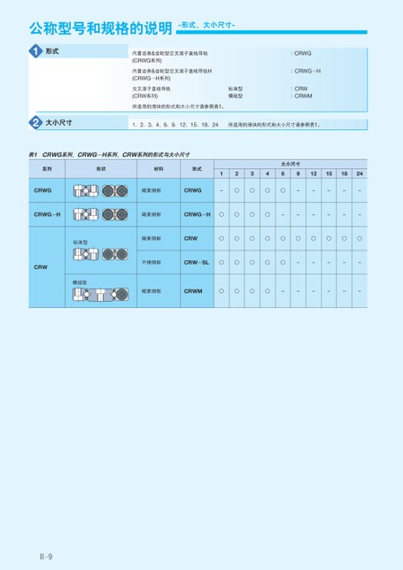 公称型号和规格的说明-形式、大小尺寸-1形式内置齿条&齿轮型交叉滚子直线导轨(CRWG系列)内置齿条&齿轮型交叉滚子直线导轨H(CRWG…H系列)交叉滚子直线导轨(CRW系列)标准型模组型所适用的滑块的形式和大小尺寸请参照表1。:CRWG:CRWG…H:CRWCRWM:2大小尺寸1、2、3、4、6、9、12、15、18、24所适用的滑块的形式和大小尺寸请参照表1。表1CRWG系列、CRWG…H系列、CRW系列的形式与大小尺寸系列形状材料形式12346912151824大小尺寸CRWGCRWG…HCRW标准型模组型碳素钢制CRWG-○○○○-----碳素钢制CRWG…H○○○○------碳素钢制CRW○○○○○○○○○○不锈钢制CRW…SL○○○○○-----碳素钢制CRWM○○○○------Ⅱ-9