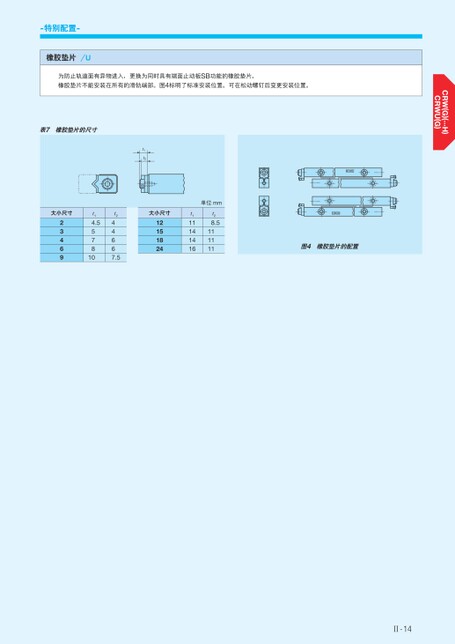-特别配置-橡胶垫片/U为防止轨道面有异物进入,更换为同时具有端面止动板SB功能的橡胶垫片。橡胶垫片不能安装在所有的滑轨端部。图4标明了标准安装位置。可在松动螺钉后变更安装位置。表7橡胶垫片的尺寸t1t2大小尺寸23469t14.557810t244667.5大小尺寸12151824单位mmt28.5111111t111141416图4橡胶垫片的配置Ⅱ-14