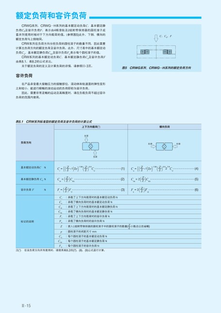 额定负荷和容许负荷CRWG系列、CRWG…H系列的基本额定动负荷C、基本额定静负荷C0及容许负荷F,表示由4根滑轨及2组附带保持器的圆柱滚子成套并列使用时相对于下方向载荷的值。(参照图5)此外,下侧、横向的额定负荷与上侧相同。CRW系列在负荷方向分担负荷的圆柱滚子的数量不同,因此需要计算出负荷方向的额定负荷及容许负荷。此外,尺寸表中的基本额定动C、C0、F负荷CU、基本额定静负荷C0U及容许负荷FU表示每个圆柱滚子的值。CRW系列的基本额定动负荷C、基本额定静负荷C0及容许负荷F由表8.1、表8.2的公式求出。关于额定负荷的定义及计算负荷的详情,请参照Ⅲ-3页。图5CRWG系列、CRWG…H系列的额定负荷方向容许负荷在产品承受最大接触应力的接触部位,滚动体和轨道面的弹性变形之和较小,能进行顺畅的滚动运动的负荷即称为容许负荷。因此,需要非常流畅的运动及高精度时,请在负载负荷不超过容许负荷的范围内使用。表8.1CRW系列标准型的额定负荷及容许负荷的计算公式上下方向载荷(1)负荷负荷横向负荷负荷负荷–1)2p}1/36(Z—2)3/4CUC=(Z—2)C0U0rF=(Z—2)FrU7/9)3/42CU(1)(2)(3)C={(Z—2a–1)2p}1/36(Z—2=2(Z—2C0a)C0UF=2(Z—2a)FU(4)(5)(6)CrCaC0rC0aFrFaZpCUC0UFU:承载了上下方向载荷时的基本额定动负荷N:承载了横向负荷时的基本额定动负荷N:承载了上下方向载荷时的基本额定静负荷N:承载了横向负荷时的基本额定静负荷N:承载了上下方向载荷时的容许负荷N:承载了横向负荷时的容许负荷N:装入1组附带保持器的圆柱滚子中的圆柱滚子的数量(Z—2小数点以后省略):圆柱滚子的间距尺寸mm:每个圆柱滚子的基本额定动负荷N:每个圆柱滚子的基本额定静负荷N:每个圆柱滚子的容许负荷N负荷方向基本额定动负荷CN={(Z—2Cr基本额定静负荷C0N容许负荷FN标记的说明注(1)在该负荷方向并列使用时,请使用表8.2的(7)、(8)、(9)公式进行计算。Ⅱ-15