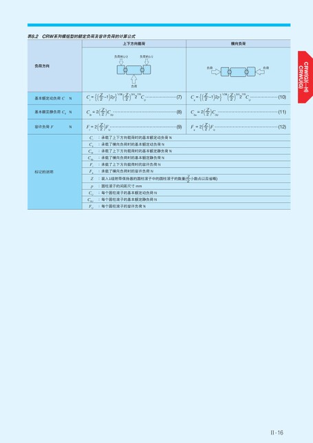 表8.2CRW系列模组型的额定负荷及容许负荷的计算公式上下方向载荷横向负荷负荷的1/2负荷的1/2负荷方向负荷负荷负荷基本额定动负荷CN={(Z—2–1)2p}1/36(Z—2Cr基本额定静负荷C0NC0r=2(Z—2)C0U7/9)3/42CU(7)(8)(9)C={(Z—2–1)2p}1/36(Z—2a)3/427/9CUC=2(Z—20a)C0UF=2(Z—2a)FU容许负荷FN标记的说明F=2(Z—2)FrUCrCaC0rC0aFrFaZpCUC0UFU:承载了上下方向载荷时的基本额定动负荷N:承载了横向负荷时的基本额定动负荷N:承载了上下方向载荷时的基本额定静负荷N:承载了横向负荷时的基本额定静负荷N:承载了上下方向载荷时的容许负荷N:承载了横向负荷时的容许负荷N:装入1组附带保持器的圆柱滚子中的圆柱滚子的数量(Z—2小数点以后省略):圆柱滚子的间距尺寸mm:每个圆柱滚子的基本额定动负荷N:每个圆柱滚子的基本额定静负荷N:每个圆柱滚子的容许负荷N(10)(11)(12)Ⅱ-16