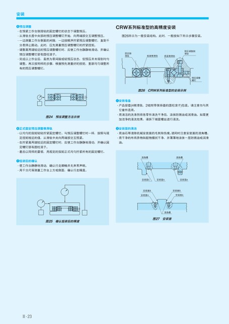 安装预压调整·在预紧工作台侧滑轨的固定螺钉的状态下调整预压。·从滑轨长度中央部的预压调整螺钉开始,向两端部交互调整预压。·一边测量工作台侧面的间隙,一边按顺序拧紧预压调整螺钉,直到千分表停止跳动。此时,应先测量预压调整螺钉的拧紧扭矩。·调整离两端较近的预压调整螺钉时,应使工作台静静地滑动,并确认预压调整螺钉部有圆柱滚子。·完成以上作业后,虽然为零间隙或轻预压状态,但预压并未得到均匀调整。再次按同样的步骤,根据预先测量好的扭矩,重新均匀调整所有的预压调整螺钉。图24预压调整方法示例CRW系列标准型的高精度安装图26所示为一般安装结构。此时,一般按如下所示步骤安装。固定侧滑轨底座侧滑轨底座侧滑轨预压调整侧滑轨预压调整螺钉图26CRW系列标准型的安装示例安装准备·产品按套(4根滑轨、2组附带保持器的圆柱滚子)包装。请注意勿与其它套件混用。·用清洁的洗涤剂将各零件清洗干净后,涂抹防锈油或润滑油。如需更加洁净的清洗效果,请拆下端面螺丝进行清洗。正式固定预压调整侧滑轨安装面的清洁·以均匀的扭矩轻轻拧紧固定螺钉。与预压调整螺钉时一样,按照与规定扭矩相近的值,从滑轨中央向两端部交互预紧。·用油石等清除机械安装面的毛刺和伤痕。请同时注意安装面的清角槽。·用干净的布将异物和脏物擦拭干净,并薄薄地涂抹一层防锈油或润滑·在拧紧离两端较近的固定螺钉时,应使工作台静静地滑动,并确认固油。定螺钉部有圆柱滚子。·最后以同样的要领,用规定的扭矩正式均匀拧紧所有的固定螺钉。组装后的确认·使工作台静静地滑动,确认行走顺畅并无异常声响。·用千分尺等测量工作台上方或侧面,确认行走精度。图25确认组装后的精度清角槽清角槽安装面C安装面A安装面A安装面B安装面A安装面B安装面A清角槽图27安装面Ⅱ-23