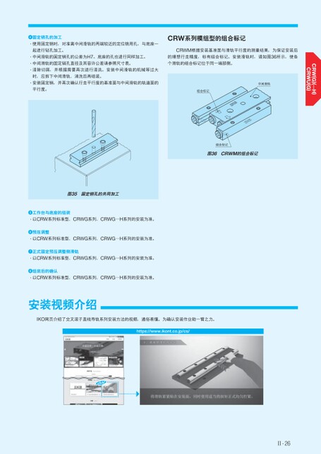 固定销孔的加工·使用固定销时,对准离中间滑轨的两端较近的定位销用孔,与底座一起进行钻孔加工。·中间滑轨的固定销孔的公差为H7。底座的孔也进行同样加工。·中间滑轨的固定销孔直径及其容许公差请参照尺寸表。·清除切屑,并根据需要再次进行清洗。安装中间滑轨的机械等过大时,应拆下中间滑轨、清洗后再组装。·安装固定销,并再次确认行走平行度的基准面与中间滑轨的轨道面的平行度。CRW系列模组型的组合标记CRWM根据安装基准面与滑轨平行度的测量结果,为保证安装后的理想行走精度,标有组合标记。安装滑轨时,请如图36所示,使各个滑轨的组合标记位于同一端部侧。组合标记中间滑轨组合标记图36CRWM的组合标记图35固定销孔的共同加工工作台与底座的组装·以CRW系列标准型、CRWG系列、CRWG…H系列的安装为准。预压调整·以CRW系列标准型、CRWG系列、CRWG…H系列的安装为准。正式固定预压调整侧滑轨·以CRW系列标准型、CRWG系列、CRWG…H系列的安装为准。组装后的确认·以CRW系列标准型、CRWG系列、CRWG…H系列的安装为准。安装视频介绍IKO网页介绍了交叉滚子直线导轨系列安装方法的视频,通俗易懂。为确认安装作业助一臂之力。https://www.ikont.co.jp/cs/Ⅱ-26