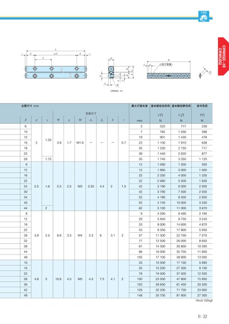 CADDWHRepZ(滚子数量)-0.30AWWgd1MCRWG⋯Hhd2tEFLn×FEt主要尺寸mm最大行程长度基本额定动负荷基本额定静负荷容许负荷peWgMd1d2htmm安装尺寸1.2523.91.7M1.6———0.71.752.51.65.52.5M32.554.421.523.82.58.63.5M43.363.124.8310.64.5M54.37.54.12371923353935121222224242525262929335357778186105335578100103126148Z6101216182228612162224303440448121822283238444810162228364248C(3)N52578290111301230144017401090186023302980319037904180474051004260584080009350113001250014300160001710010500152001950023500286003220035700C0(3)N71712001430191021502630335015003000400055006000750085001000011000649097301460017800227002600030800357003890017100273003750047800614007170081900F(3)N2393984786387178771120500100013301830200025002830333036702160324048705950757086501030011900130005690910012500159002050023900273001N≈0.102kgfⅡ-32