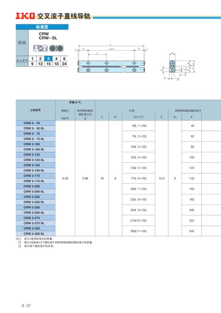 -0.3A0WWgd1Mhd2H交叉滚子直线导轨标准型CRWCRW···SL形状大小尺寸19212315418624tEFLn×FEt外观附带保持器的圆柱滚子AHL(n×F)EDW50(1×25)75(2×25)100(3×25)125(4×25)150(5×25)0.502.96188175(6×25)12.53200(7×25)225(8×25)250(9×25)275(10×25)300(11×25)R426282102122142162182202222242质量(参考)滑轨(1)kg/m附带保持器的圆柱滚子(2)g公称型号CRW3-50CRW3-50SLCRW3-75CRW3-75SLCRW3-100CRW3-100SLCRW3-125CRW3-125SLCRW3-150CRW3-150SLCRW3-175CRW3-175SLCRW3-200CRW3-200SLCRW3-225CRW3-225SLCRW3-250CRW3-250SLCRW3-275CRW3-275SLCRW3-300CRW3-300SL注(1)(2)(3)表示1根滑轨每米的质量。表示1组装有10个圆柱滚子的附带保持器的圆柱滚子的质量。表示每个圆柱滚子的负荷。Ⅱ-37