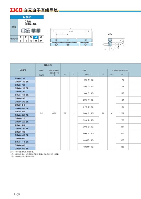 -0.3A0WWgd1Mhd2H交叉滚子直线导轨标准型CRWCRW···SL形状大小尺寸19212315418624tEFLn×FEt外观附带保持器的圆柱滚子AHL(n×F)EDW80(1×40)120(2×40)160(3×40)200(4×40)240(5×40)0.826.912211280(6×40)204320(7×40)360(8×40)400(9×40)440(10×40)480(11×40)R73101136164199227262297325360388质量(参考)滑轨(1)kg/m附带保持器的圆柱滚子(2)g公称型号CRW4-80CRW4-80SLCRW4-120CRW4-120SLCRW4-160CRW4-160SLCRW4-200CRW4-200SLCRW4-240CRW4-240SLCRW4-280CRW4-280SLCRW4-320CRW4-320SLCRW4-360CRW4-360SLCRW4-400CRW4-400SLCRW4-440CRW4-440SLCRW4-480CRW4-480SL注(1)(2)(3)表示1根滑轨每米的质量。表示1组装有10个圆柱滚子的附带保持器的圆柱滚子的质量。表示每个圆柱滚子的负荷。Ⅱ-39