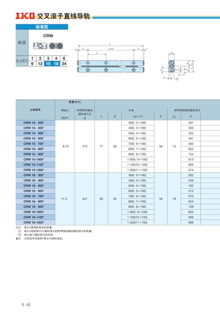 -0.3A0WWgd1Mhd2H交叉滚子直线导轨标准型CRW形状大小尺寸19212315418624tEFLn×FEt公称型号CRW15-300*CRW15-400*CRW15-500*CRW15-600*CRW15-700*CRW15-800*CRW15-900*CRW15-1000*CRW15-1100*CRW15-1200*CRW18-300*CRW18-400*CRW18-500*CRW18-600*CRW18-700*CRW18-800*CRW18-900*CRW18-1000*CRW18-1100*CRW18-1200*质量(参考)滑轨(1)kg/m附带保持器的圆柱滚子(2)g外观附带保持器的圆柱滚子AHL(n×F)EDW8.75273713611.34478340300(2×100)400(3×100)500(4×100)600(5×100)700(6×100)800(7×100)900(8×100)1000(9×100)1100(10×100)1200(11×100)300(2×100)400(3×100)500(4×100)600(5×100)700(6×100)800(7×100)900(8×100)1000(9×100)1100(10×100)1200(11×100)50155018R261330422491583652744813905974262346430514570654738822906990注(1)(2)(3)备注表示1根滑轨每米的质量。表示1组装有10个圆柱滚子的附带保持器的圆柱滚子的质量。表示每个圆柱滚子的负荷。公称型号末尾的*表示为准标准品。Ⅱ-45
