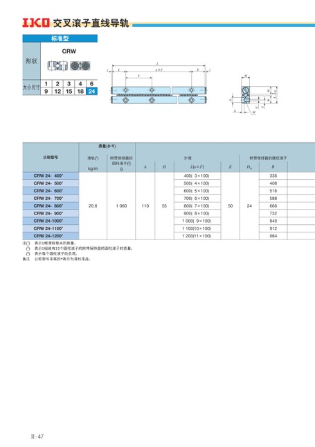 -0.3A0WWgd1Mhd2H交叉滚子直线导轨标准型CRW形状大小尺寸19212315418624tEFLn×FEt公称型号CRW24-400*CRW24-500*CRW24-600*CRW24-700*CRW24-800*CRW24-900*CRW24-1000*CRW24-1100*CRW24-1200*质量(参考)滑轨(1)kg/m附带保持器的圆柱滚子(2)g外观附带保持器的圆柱滚子AHL(n×F)EDW20.6106011055400(3×100)500(4×100)600(5×100)700(6×100)800(7×100)900(8×100)1000(9×100)1100(10×100)1200(11×100)5024R336408516588660732840912984注(1)(2)(3)备注表示1根滑轨每米的质量。表示1组装有10个圆柱滚子的附带保持器的圆柱滚子的质量。表示每个圆柱滚子的负荷。公称型号末尾的*表示为准标准品。Ⅱ-47