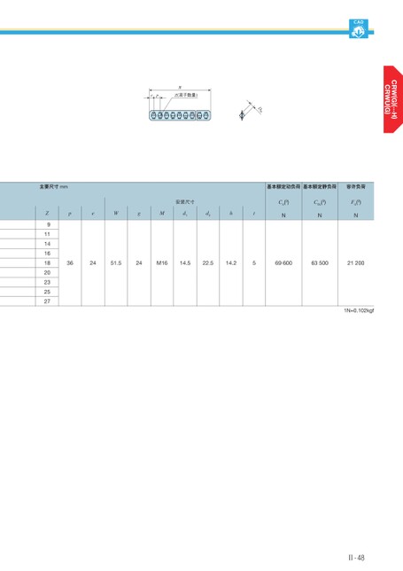 CADRepZ(滚子数量)DW主要尺寸mm基本额定动负荷基本额定静负荷容许负荷peWgMd1d2ht安装尺寸CU(3)NC0U(3)NFU(3)N362451.524M1614.522.514.25696006350021200Z911141618202325271N≈0.102kgfⅡ-48