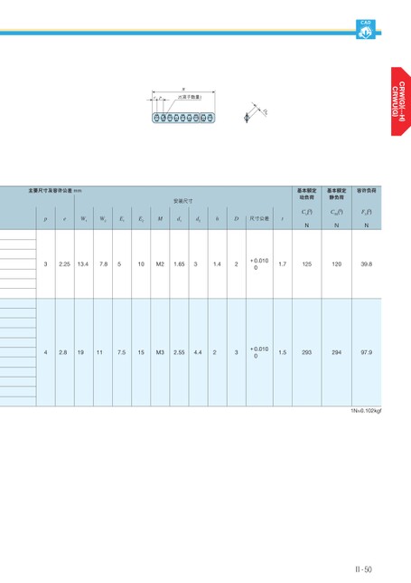 CADRepZ(滚子数量)DW主要尺寸及容许公差mm安装尺寸peW1W2E1E2Md1d2hD尺寸公差t基本额定动负荷基本额定静负荷容许负荷CU(3)NC0U(3)NFU(3)N32.2513.47.8510M21.6531.42+0.01001.712512039.842.819117.515M32.554.423+0.01001.529329497.91N≈0.102kgfⅡ-50