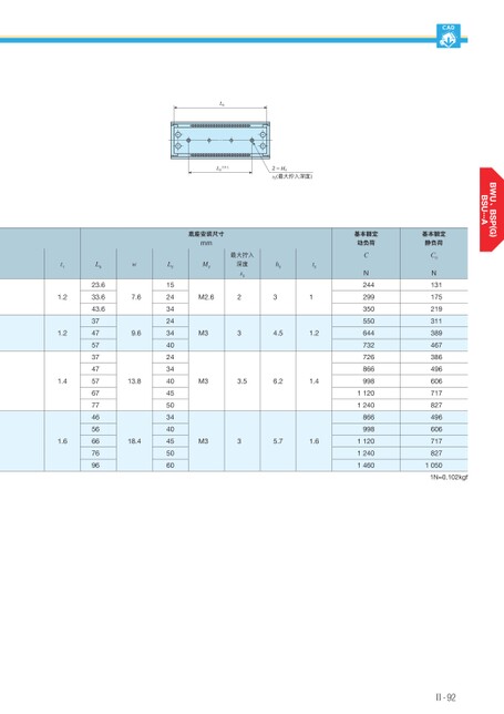 、Lb±0.1L22-M2s2(最大拧入深度)底座安装尺寸mmM2M2.6M3最大拧入深度s223h23t214.51.2M33.56.21.4M335.71.6t11.21.21.41.6w7.69.613.818.4Lb23.633.643.637475737475767774656667696L215243424344024344045503440455060CAD基本额定动负荷基本额定静负荷CN24429935055064473272686699811201240866998112012401460C0N13117521931138946738649660671782749660671782710501N≈0.102kgfⅡ-92
