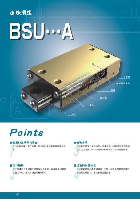 滚珠滑组BSU⋯A工作台间隙调整螺钉钢球保持器导轨底座Points●轻量的直线导向设备●安装容易工作台和底座为铝合金制,是小型轻量的有限直线导向设预压量已调整到适当状态,只需用螺栓固定经过精密磨削备。加工的安装面,即可轻松地轻松地进行稳定的直线运动。●动作顺畅●出色的耐腐蚀性由于钢球由合成树脂制成地保持器导向,在高精度的圆轴钢球和轨道采用不锈钢制成,工作台和底座的表面也经过轨道上滚动,因此可轻盈顺畅地动作。阳极氧化膜加工,因此耐腐蚀性出色。Ⅱ-95