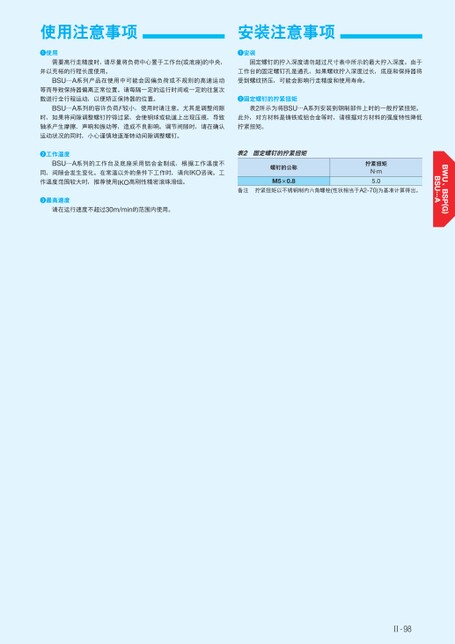 使用注意事项安装注意事项使用安装需要高行走精度时,请尽量将负荷中心置于工作台(或底座)的中央,固定螺钉的拧入深度请勿超过尺寸表中所示的最大拧入深度。由于并以充裕的行程长度使用。工作台的固定螺钉孔是通孔,如果螺纹拧入深度过长,底座和保持器将BSU…A系列产品在使用中可能会因偏负荷或不规则的高速运动等而导致保持器偏离正常位置。请每隔一定的运行时间或一定的往复次受到螺纹挤压,可能会影响行走精度和使用寿命。数进行全行程运动,以便矫正保持器的位置。固定螺钉的拧紧扭矩BSU…A系列的容许负荷F较小,使用时请注意。尤其是调整间隙时,如果将间隙调整螺钉拧得过紧,会使钢球或轨道上出现压痕,导致表2所示为将BSU…A系列安装到钢制部件上时的一般拧紧扭矩。此外,对方材料是铸铁或铝合金等时,请根据对方材料的强度特性降低轴承产生摩擦、声响和振动等,造成不良影响。调节间隙时,请在确认拧紧扭矩。运动状况的同时,小心谨慎地逐渐转动间隙调整螺钉。工作温度BSU…A系列的工作台及底座采用铝合金制成,根据工作温度不同,间隙会发生变化。在常温以外的条件下工作时,请向IKO咨询。工作温度范围较大时,推荐使用IKO高刚性精密滚珠滑组。表2固定螺钉的拧紧扭矩螺钉的公称M5×0.8拧紧扭矩N·m5.0备注拧紧扭矩以不锈钢制内六角螺栓(性状相当于A2-70)为基准计算得出。最高速度请在运行速度不超过30m/min的范围内使用。Ⅱ-98