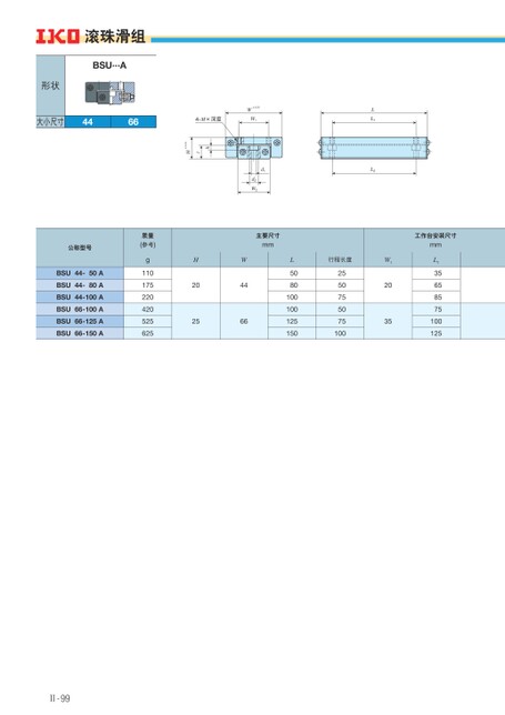 工作台安装尺寸mmL1356585751001251LLL2d1d2W2主要尺寸mm4-M×深度±0.5WW1hHt±0.25H2025W4466L5080100100125150行程长度2550755075100W12035滚珠滑组BSU···A形状大小尺寸4466公称型号BSU44-50ABSU44-80ABSU44-100ABSU66-100ABSU66-125ABSU66-150A质量(参考)g110175220420525625Ⅱ-99