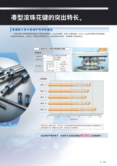 凑型滚珠花键的突出特长。高速耐久性与免维护性珠联璧合滚珠花键G外筒的钢球循环通道中内置有润滑部件C-Lube自润滑管,实现了长期免维护。由于C-Lube自润滑管内的润滑油能长期保持润滑性能,从而减少了烦琐的润滑管理工时,通过废除加油机构,可降低整个系统的成本。以在贴片机上使用为例的耐久试验《试验条件》润滑条件试验方法运行条件仅C-Lube自润滑部件内的润滑油未封入润滑脂振动试验机安装姿势最高速度速度加周行程长度立轴860mm/s10G18.2Hz15mmMAG励振装置《试验结果》MAG5MAG6MAG8MAG10MAG12往返次数7.79亿次耐久性极强!往返次数7.43亿次耐久性极强!往返次数6.92亿次耐久性极强!往返次数7.67亿次耐久性极强!往返次数8.80亿次耐久性极强!02.04.06.08.010.0往返次数亿次即使是立轴、超高节拍运行,也可仅由C-Lube自润滑部件内部的润滑油实现总往返次数达2亿次的极高耐久性!如果试验条件为在一般的贴片机上使用,可实现长达10年的免维护!!在这样的严酷环境下,也实现了总往返次数达6亿次以上的免维护!!Ⅱ-104