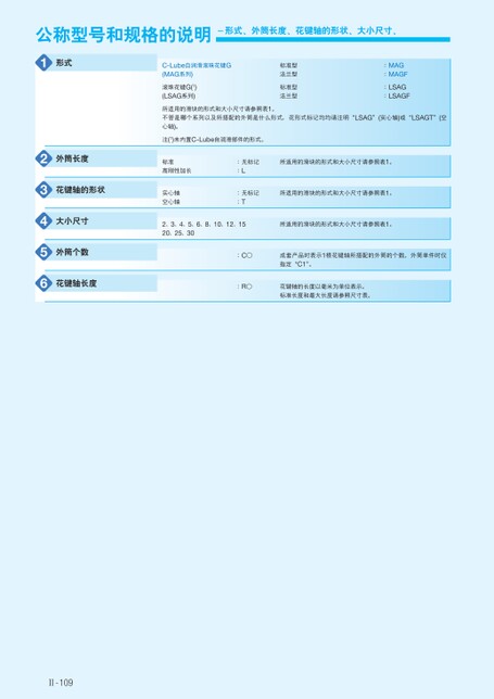 公称型号和规格的说明-形式、外筒长度、花键轴的形状、大小尺寸、1形式23456外筒长度花键轴的形状大小尺寸外筒个数花键轴长度C-Lube自润滑滚珠花键G(MAG系列)滚珠花键G(1)(LSAG系列)标准型法兰型标准型法兰型:MAG:MAGF:LSAG:LSAGF所适用的滑块的形式和大小尺寸请参照表1。不管是哪个系列以及所搭配的外筒是什么形式,花形式标记均均请注明“LSAG”(实心轴)或“LSAGT”(空心轴)。注(1)未内置C-Lube自润滑部件的形式。标准高刚性加长实心轴空心轴:无标记:L:无标记:T所适用的滑块的形式和大小尺寸请参照表1。所适用的滑块的形式和大小尺寸请参照表1。2、3、4、5、6、8、10、12、1520、25、30所适用的滑块的形式和大小尺寸请参照表1。:C○:R○成套产品时表示1根花键轴所搭配的外筒的个数。外筒单件时仅指定“C1”。花键轴的长度以毫米为单位表示。标准长度和最大长度请参照尺寸表。Ⅱ-109