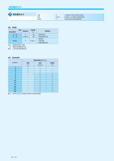 -预压量的大小-7预压量的大小间隙标准轻预压:T0:无标记:T1订购成套产品或外筒单件时指定。预压量大小的详细内容请参照表2。所适用的预压种类请参照表3。表2预压量预压的种类间隙标准轻预压项目预压标记T0(无标记)预压量N0(1)0(2)T10.02C0使用条件·极轻微运动·轻微的精密运动·振动极小·负荷均衡·轻微的精密运动注(1)(2)备注零间隙或有微小间隙。零预压或轻微预压状态。C0表示基本额定静负荷。表3预压的适用大小尺寸预压的种类(预压标记)间隙(T0)标准(无标记)轻预压(T1)234568101215202530○○○---------○○○○○○○○○○○○---○○○○○○○○○备注表中有号的部分也适用于自由组合规格。Ⅱ-111