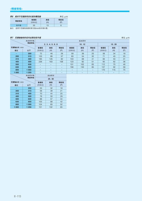 -精度等级-表6相对于花键部有效长度的槽扭曲单位μm大小尺寸10、12高级(H)36546882102130--普通级(无标记)5983103123151190--精密级(P)203241516585--普通级(无标记)56718395112137170-15、20高级(H)344553627592115-单位μm精密级(P)18253138465875-精密级(P)6精密级(P)265782108----精密级(P)1821252934425265精度等级普通级(无标记)高级(H)容许值13适用于花键有效部的每100mm的任意位置。33备注表7花键轴轴线的径向全跳动容许值大小尺寸与精度等级以下20031540050063080010001250大小尺寸与精度等级以下20031540050063080010001250普通级(无标记)72133185236----普通级(无标记)5358707888103124151花键轴全长mm超过-2003154005006308001000花键轴全长mm超过-20031540050063080010002、3、4、5、6、8高级(H)4689126163----大小尺寸25、30高级(H)32394450576883102Ⅱ-113