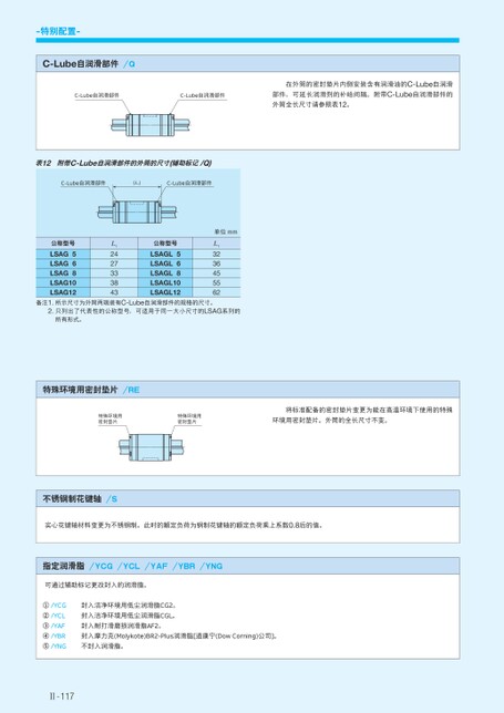 -特别配置-C-Lube自润滑部件/QC-Lube自润滑部件C-Lube自润滑部件在外筒的密封垫片内侧安装含有润滑油的C-Lube自润滑部件,可延长润滑剂的补给间隔。附带C-Lube自润滑部件的外筒全长尺寸请参照表12。表12附带C-Lube自润滑部件的外筒的尺寸(辅助标记/Q)C-Lube自润滑部件(L1)C-Lube自润滑部件公称型号LSAG56LSAGLSAG8LSAG10LSAG12L12427333843公称型号5LSAGL6LSAGLLSAGL8LSAGL10LSAGL12单位mmL13236455562备注1.所示尺寸为外筒两端装有C-Lube自润滑部件的规格的尺寸。2.只列出了代表性的公称型号,可适用于同一大小尺寸的LSAG系列的所有形式。特殊环境用密封垫片/RE特殊环境用密封垫片特殊环境用密封垫片将标准配备的密封垫片变更为能在高温环境下使用的特殊环境用密封垫片。外筒的全长尺寸不变。不锈钢制花键轴/S实心花键轴材料变更为不锈钢制。此时的额定负荷为钢制花键轴的额定负荷乘上系数0.8后的值。指定润滑脂/YCG/YCL/YAF/YBR/YNG可通过辅助标记更改封入的润滑脂。①/YCG封入洁净环境用低尘润滑脂CG2。②/YCL③/YAF封入洁净环境用低尘润滑脂CGL。封入耐打滑磨损润滑脂AF2。④/YBR封入摩力克(Molykote)BR2-Plus润滑脂[道康宁(DowCorning)公司]。⑤/YNG不封入润滑脂。Ⅱ-117