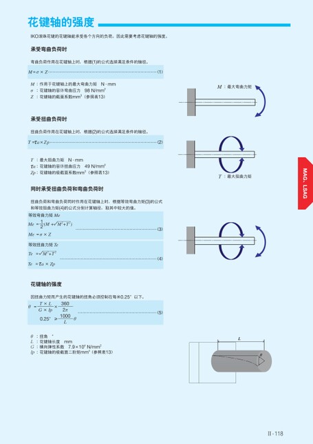 花键轴的强度IKO滚珠花键的花键轴能承受各个方向的负荷。因此需要考虑花键轴的强度。承受弯曲负荷时弯曲负荷作用在花键轴上时,根据(1)的公式选择满足条件的轴径。M=σ×Z(1)M:作用于花键轴上的最大弯曲力矩N·mmσZ:花键轴的容许弯曲应力98N/mm2:花键轴的截面系数mm3(参照表13)承受扭曲负荷时扭曲负荷作用在花键轴上时,根据(2)的公式选择满足条件的轴径。T=τa×Zp(2)T:最大扭曲力矩N·mmτa:花键轴的容许扭曲应力49N/mm2Zp:花键轴的极截面系数mm3(参照表13)同时承受扭曲负荷和弯曲负荷时扭曲负荷和弯曲负荷同时作用在花键轴上时,根据等效弯曲力矩(3)的公式和等效扭曲力矩(4)的公式分别计算轴径,取其中较大的值。(3)等效弯曲力矩MeMe=12(M+M2+T2)√Me=σ×Z等效扭曲力矩TeTe=M2+T2√Te=τa×Zp(4)花键轴的强度因扭曲力矩而产生的花键轴的扭角必须控制在每米0.25°以下。θ=T×LG×Ip×0.25°≥3602π1000Lθ(5):扭角°θL:花键轴长度mmG:横向弹性系数7.9×104N/mm2Ip:花键轴的极截面二阶矩mm4(参照表13)M:最大弯曲力矩T:最大扭曲力矩LLθθⅡ-118