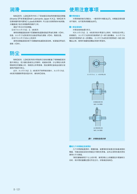 润滑使用注意事项MAG系列、LSAG系列中封入了添加极压添加剂的锂皂基润滑脂(AlvaniaEP润滑脂2[ShellLubricantsJapanK.K.])。MAG系列在钢球循环部内置有C-Lube自润滑部件,可以延长润滑剂的补给间隔,大幅度减少加注润滑脂等的维护工时。请如下所示补充润滑脂。①关于大小尺寸为2、3、4的系列请将润滑脂直接涂抹于花键轴的轨道面或指定带油孔规格(/OH)。但是,大小尺寸为2的系列无法指定带油孔规格(/OH),敬请注意。②关于大小尺寸为5以上的系列请将润滑脂直接涂抹于花键轴的轨道面或滚动体。或请指定带油孔外筒的配合外筒和轴承座孔的配合,一般采用中间配合(J7)。对精度及刚性要求不高时,也可使用间隙配合(H7)。一般安装结构外筒安装例如图1所示。对大小尺寸为2、3、4的系列的外筒进行止转时,利用设在外筒上的锪锥孔,大小尺寸为2的系列使用M1.2~M1.6的螺丝、大小尺寸为3的系列使用M1.6~2的螺丝、大小尺寸为4的系列使用M2~M2.5的螺丝止转。使用时请避免因螺丝而使外筒变形。规格(/OH)。防尘MAG系列、LSAG系列的外筒虽然已经标准配备了特殊橡胶密封垫片来防尘,但大量垃圾或灰尘浮游时,或诸如切屑、沙尘等较大的异物粘附在花键轴上时,彻底防尘非常困难,因此推荐在直线运动部分安装防护盖进行防尘。此外,大小尺寸为2、3、4的系列不附带密封垫片。大小尺寸为3、4的系列需要附带密封垫片时,请向IKO咨询。Ⅱ-121大小尺寸为2、3、4的外筒止转标准型安装示例(油孔/OH规格)法兰型安装示例(油孔/OH规格)图1外筒的安装示例使几个外筒靠近后使用时几个外筒紧贴使用时,根据机械、装置等的安装面及安装基准面的精度,可能会造成实际负荷超过计算的负荷值。此时必须将负载负荷估算得大于计算值。1根花键轴使用2个以上的外筒、使用2根以上的键固定外筒旋转方向时,将外筒的键槽位置对齐后交付。详情请咨询IKO。