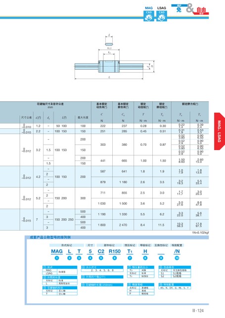 、MAGCADLSAGCAD(L1)L2LdD花键轴尺寸及容许公差mm基本额定动负荷(4)基本额定静负荷(4)额定动扭矩(4)额定静扭矩(4)额定静力矩(4)L(3)最大长度尺寸公差00–0.010–0.010d1(2)1.22.2d2---50100100150CN222251C0N237285TN·m0.280.45T0N·m0.300.513033800.700.874416651.001.5058764187911807118551030150011901330180024701.82.62.53.65.58.41.93.53.05.26.211.5TXN·m0.221.40.311.90.523.800.522.90.523.800.522.91.508.601.07.93.219.31.711.75.027.63.322.010.356.3TYN·m0.392.40.533.30.906.500.905.00.906.500.905.02.6015.01.813.65.533.43.020.38.647.85.638.117.897.51N≈0.102kgf1001502001502001502003005004005004000–0.0123.21.5100150-1.5-2-2-2-2-3-31001501502001502002500–0.0124.20–0.0125.20–0.0157成套产品公称型号的排列例9自由组合无标记S1S2非互换性规格S1规格S2规格10特别配置BS、N、OH、Q、RE、S、YⅡ-124预压量的大小7T0无标记T1间隙标准轻预压8精度等级无标记HP普通级高级精密级4大小尺寸2、3、4、5、6、85外筒的个数(2个)6花键轴的长度(150mm)标记标准高刚性加长L无2外筒的长度实心轴空心轴标记T无3花键轴的形状1形式MAGLSAG标准型形式标记尺寸部件标记预压标记等级标记互换性标记特别配置MAG1L2T354C2R15056T17H8/N109