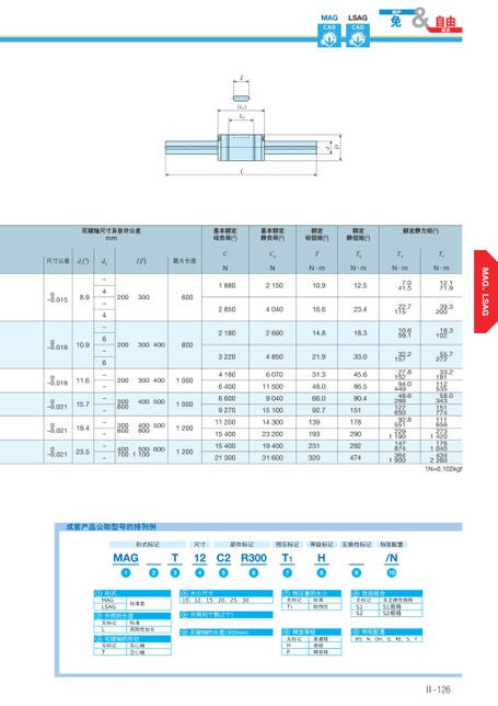 、MAGCADLSAGCAD(L1)L2LdD花键轴尺寸及容许公差mm基本额定动负荷(3)基本额定静负荷(3)额定动扭矩(3)额定静扭矩(3)额定静力矩(3)尺寸公差d1(1)0–0.0158.90–0.01810.90–0.01811.60–0.02115.70–0.02119.40–0.02123.5d2-4-4-6-6--------L(2)最大长度20030060020030040080020030040010003006004005001000300600400500800120040070011005006001200CNC0N1880215028504040218026903220418064006600927011200154001540021300485060701150090401510014300232001940031600TN·m10.916.614.821.931.348.066.092.7139193231320T0N·m12.523.418.333.045.686.590.4151178290292474TXN·m7.041.522.711510.659.132.2157TYN·m12.171.939.320018.310255.727227.815294.044948.628812765092.85512291190147874364190033.218111253558.03431517741116562731420176104043422601N≈0.102kgfⅡ-126形式标记MAG12T3尺寸124部件标记预压标记等级标记互换性标记特别配置C2R30056T17H8/N1097预压量的大小无标记T1标准轻预压8精度等级无标记HP普通级高级精密级9自由组合无标记S1S2非互换性规格S1规格S2规格10特别配置BS、N、OH、Q、RE、S、Y大小尺寸410、12、15、20、25、305外筒的个数(2个)6花键轴的长度(300mm)标记标准高刚性加长L无2外筒的长度实心轴空心轴标记T无3花键轴的形状1形式MAGLSAG标准型成套产品公称型号的排列例