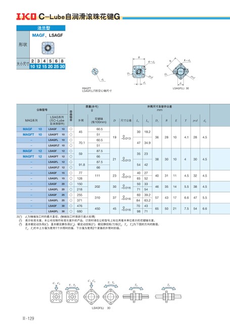 C、C0T、T0TYTXC、C0T、T030LSAGF(L)pcdd2MAGFTLSAGF(L)T的空心轴尺寸D1d1pcdD1d1LSAGF(L)30B4-d3B4-d3C-Lube自润滑滚珠花键G法兰型MAGF、LSAGF形状520625830415231210大小尺寸外筒尺寸及容许公差mmD尺寸公差L1L2D1BETpcdd3190–0.013210–0.013233037450–0.0130–0.0160–0.0160–0.0163018.24734.93523544240655071608470982752335439.263.243713628104.1284.53830104304.54031114.5324.54635145.5384.55743176.6475.56550217.5546.6质量(参考)g花键轴(每100mm)60.55160.55187.56687.566111202310450外筒4570.15991.877128150218255371476680自由组合○○○○○○○○○○○○○○○○LSAG系列(无C–Lube自润滑部件)LSAGFLSAGFTLSAGFLLSAGFLTLSAGFLSAGFTLSAGFLLSAGFLTLSAGFLSAGFLLSAGFLSAGFLLSAGFLSAGFLLSAGFLSAGFL10101010121212121515202025253030公称型号MAG系列MAGFMAGFT1010--MAGFMAGFT1212----------注(1)(2)(3)d1为轴端加工时的最大直径。(轴端加工时请进行退火处理)表示标准长度。本公司也制作标准长度外的产品,订货时请在公称型号上标出用毫米单位表示的花键轴长度。基本额定动负荷(C)、基本额定静负荷(C0)、额定动扭矩(T)、额定静扭矩/力矩(T0、TX、TY)为下图的方向的数值。TX、TY栏中上方值为使用1个外筒时的值,下方值为使用2个紧靠的外筒时的值。Ⅱ-129