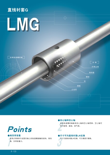 直线衬套GLMG设有轨道槽的轴外筒外筒主体保持器钢球环侧板止动环Points●高负荷容量●实心轴和空心轴设有轨道槽的轴备有实心轴和空心轴两种,空心轴可用于配管、配线、排气等。●尺寸可与直线衬套LM互换采用2列钢球与设置在轴上的轨道槽接触的结构,刚性尺寸与直线衬套LM互换,可方便进行替换。高,负荷容量大。Ⅱ-133